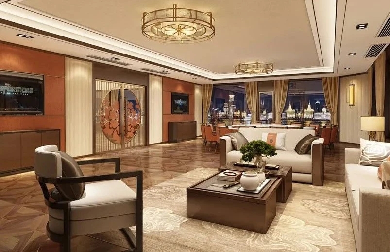 一层甲板客舱布局宽敞舒适,落地玻璃全通透,可观光、可接待。