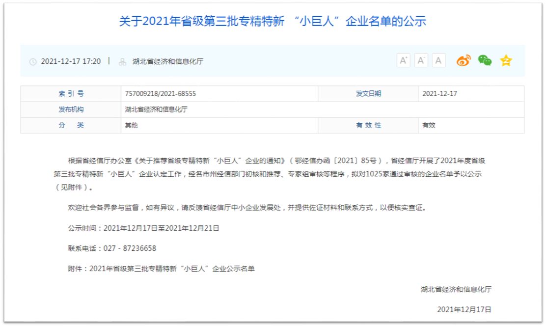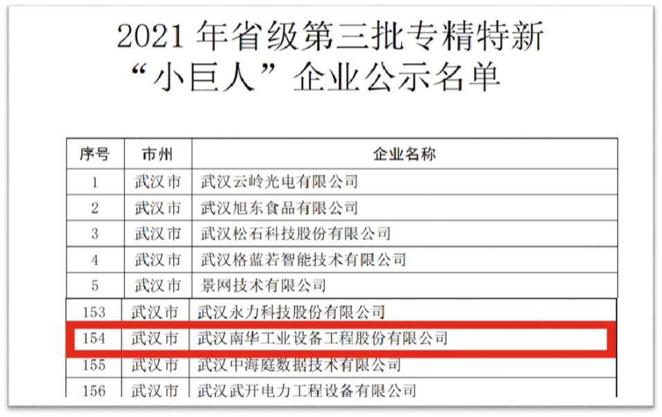 12月17日,湖北省经信厅公示了2021年省级第三批专精特新 “小巨人”企业名单,william威廉中文官网工业名列其中,成功入选湖北省专精特新 “小巨人”企业。