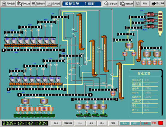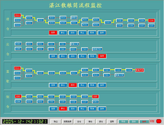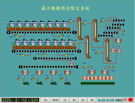 湛江港散粮码头装卸储运工艺系统技改工程被控设备近300台,根据现场设备情况,PLC系统设立一个主站和10个远程IO站、CPU、电源、远程I/O、工业控制网络(Modbus Plus)均采用冗余设备、控制系统以TSX Quantum系列作为主站,以TSX Momentum系列作为子站,为以工业控制计算机作为中央操作站。主站负责将现场I/O信号采集、回路控制、联锁顺序控制,现场所有的信号通过电缆引到主站。子站负责将现场I/O信号采集并传送到主站。中央操作站则以INTELLUTION FIX-7.0组态软件作为系统操作平台,负责设备运行的状态监控,生产信息处理、打印、系统起停命令发送、数据分析、设定值给定等功能。主站和操作站通过工业以太网完成它们之间的信息和数据交换,主站与子站之间采用Interbus进行数据交换,子站也子站之间则采用Modbus PLUS总线进行数据通讯,真正实现了分散控制、集中管理。