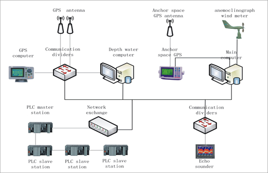 铺排船自动控制系统应用了DGPS全球定位系统、多通道测深仪、PLC可编程序控制器现场控制、风速风向仪、四角吃水仪等多种先进设备,采用数学模糊控制理论并辅以先进的控制手段及媒体计算机动态监视等技术,将所测得的数据进行综合处理,获得航道铺排的正确操作指令。不仅可为传统手动作业方式提供多样的现场采集数据图形化显示、协助操作者更好地完成作业,同时可按预定轨迹实现全过程的自动铺排作业、记录作业工作量,可根据需要打印出实时或历史数据、曲线等资料。整个自动控制系统核心由三台加固一体机和PLC主站及触摸屏构成,铺排误差精度可控制在1.5-2.0m范围内。控制系统原理图如下: